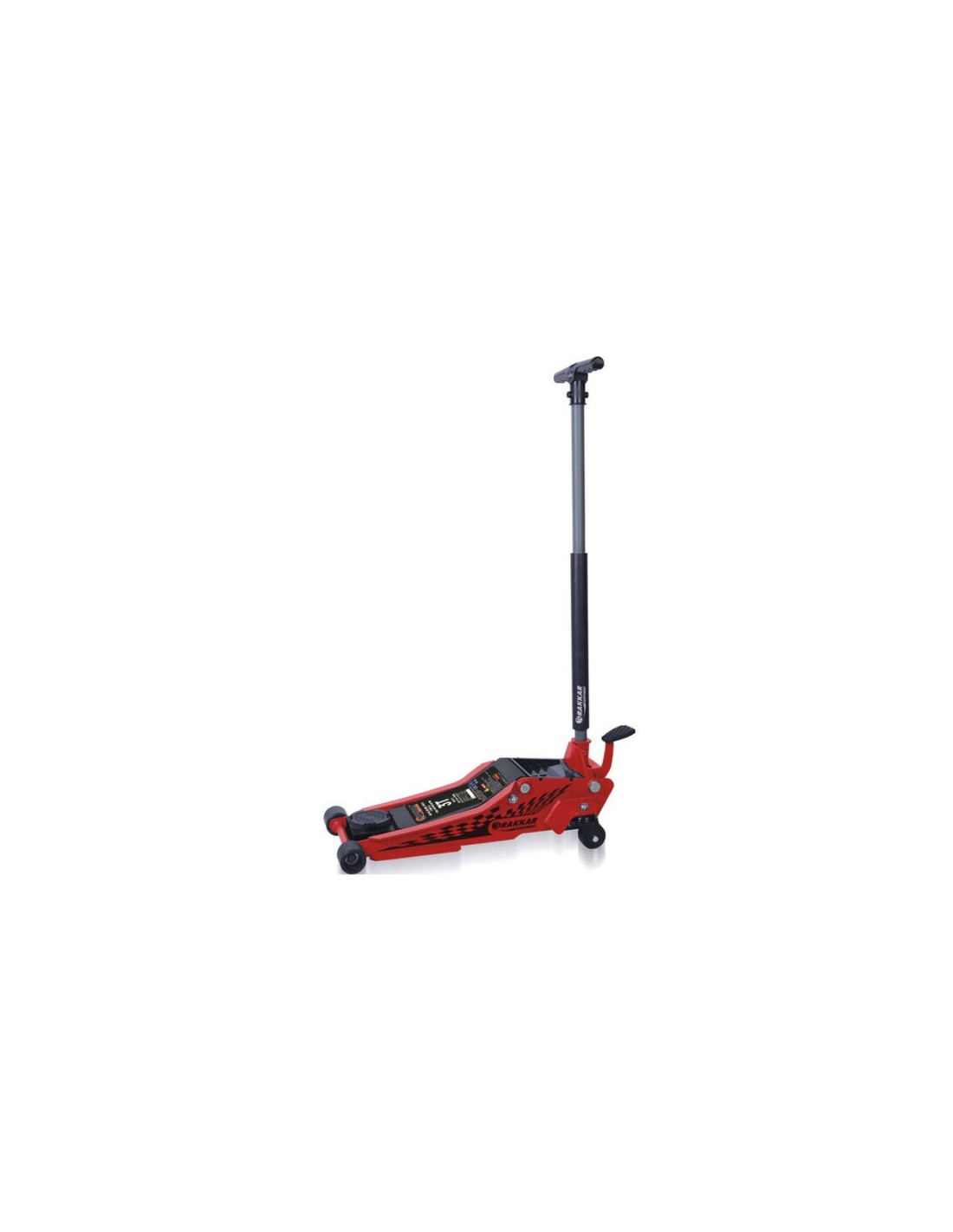 Cric rouleur 3 tonnes avec pédale double piston et roues en nylon pour une montée rapide et une descente contrôlée.